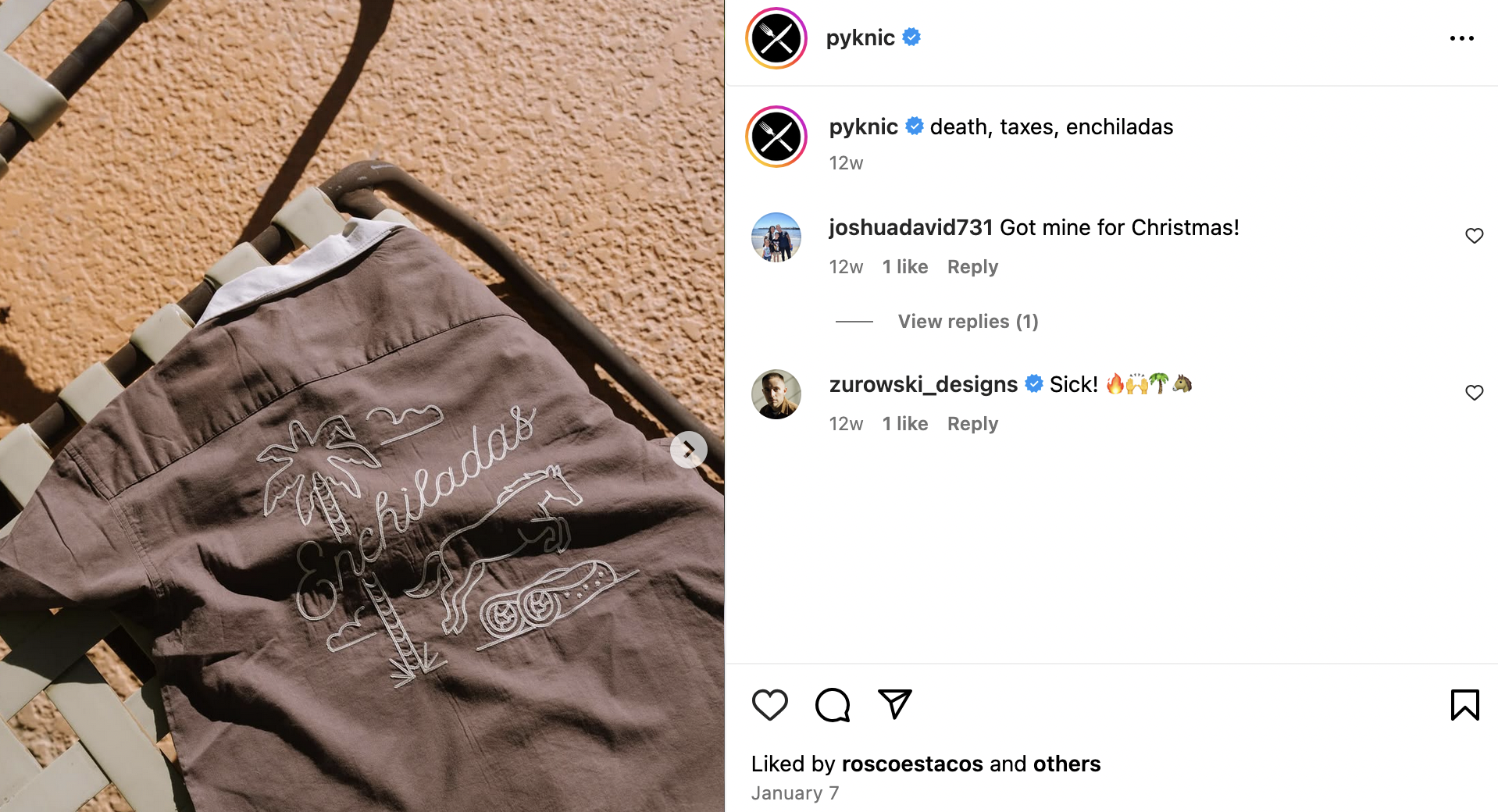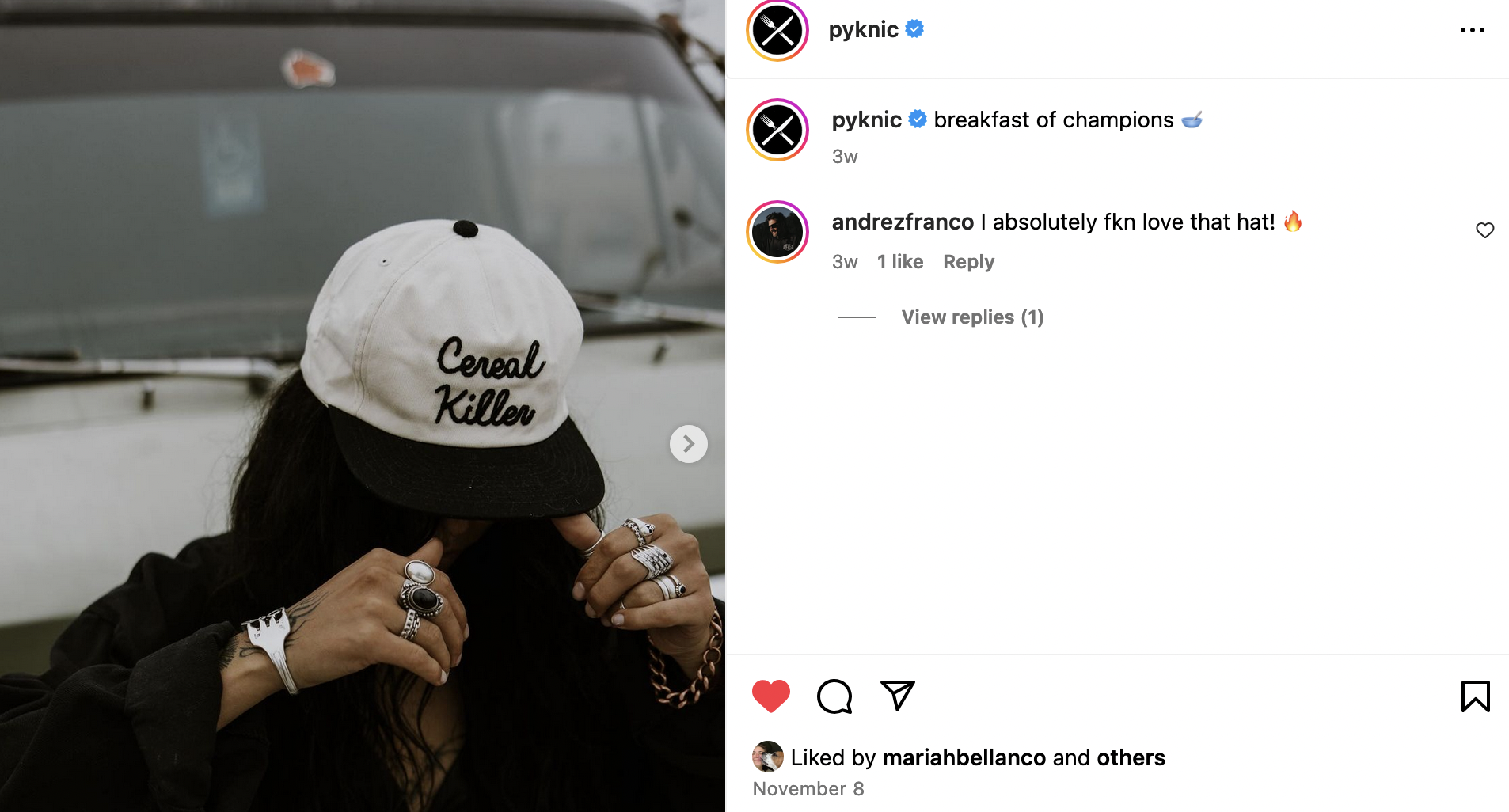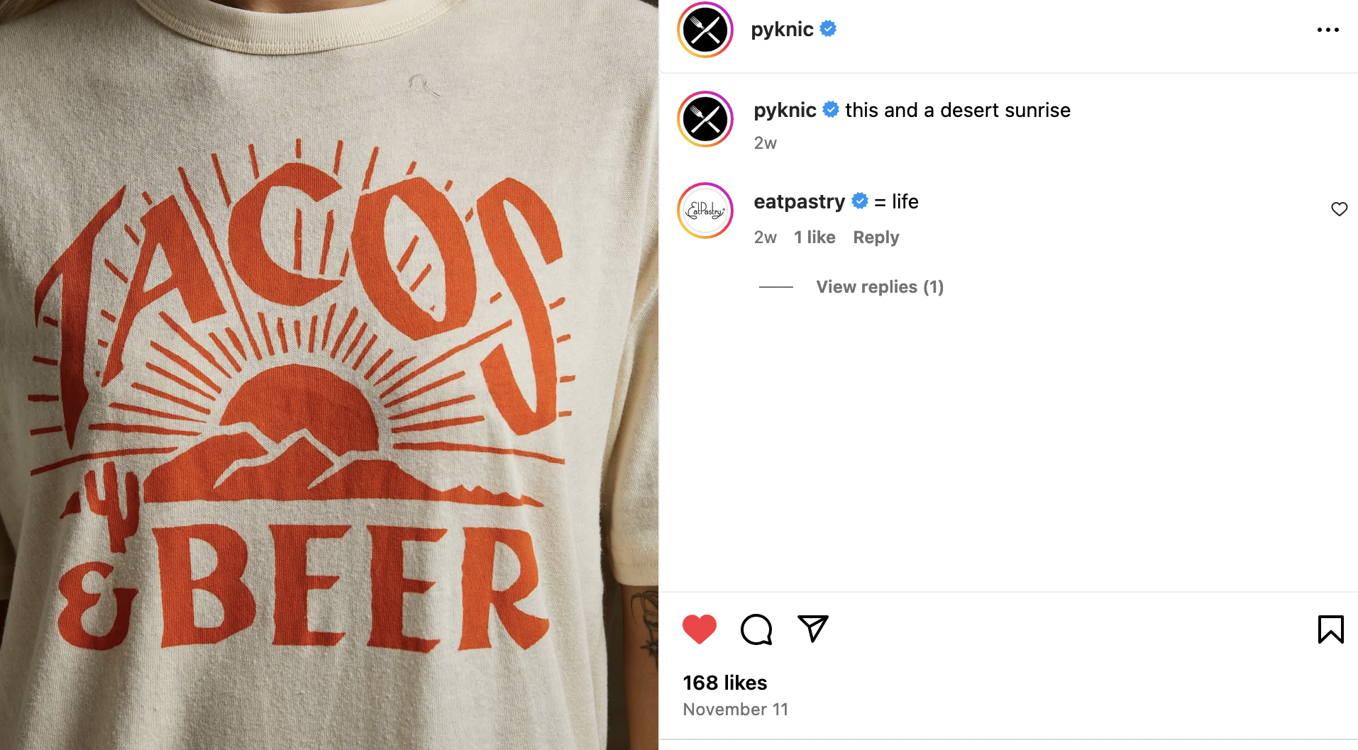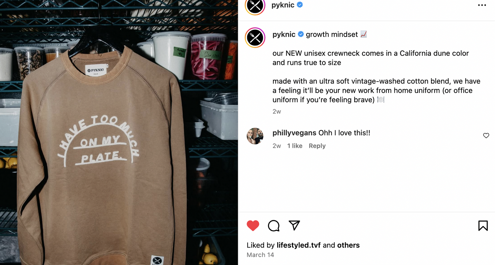 Social media management (content calendar creation, strategy, community management) for Pyknic, a fun and snarky DTC food-centric clothing brand (ongoing)