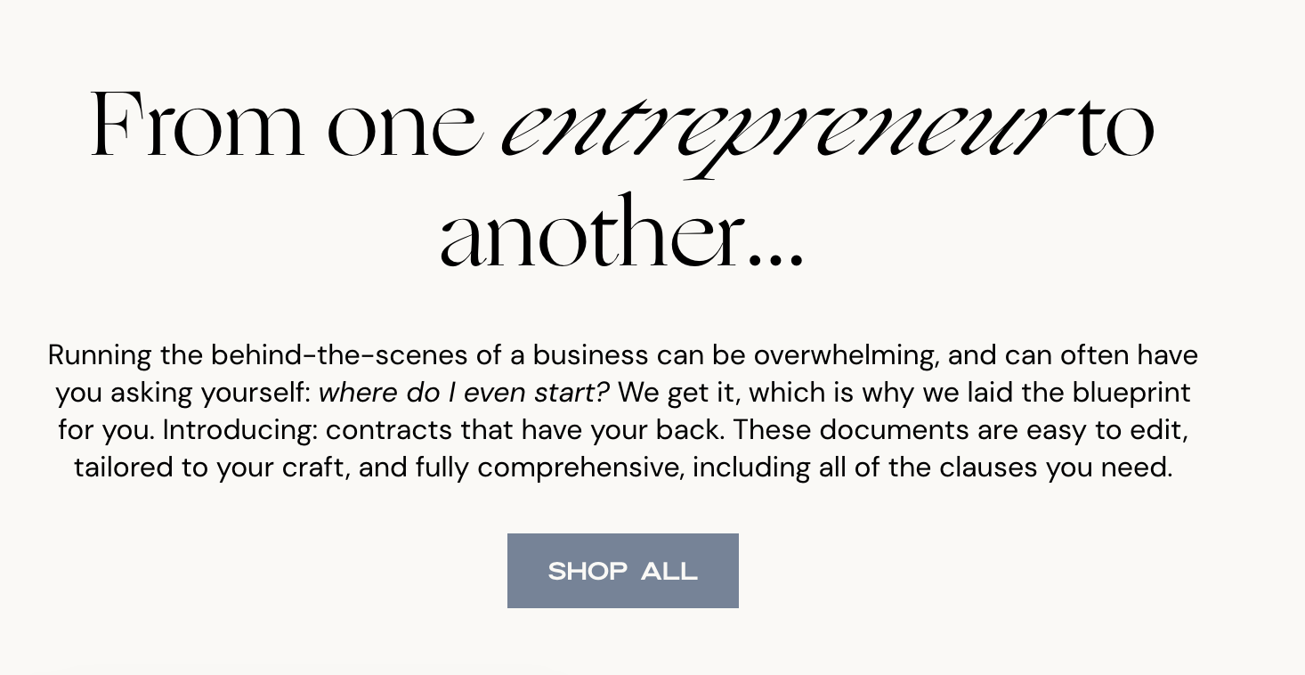 Freelance copywriter for The Artists’ Lawyer, a contract law service for creatives + small business owners (summer - fall ‘23)