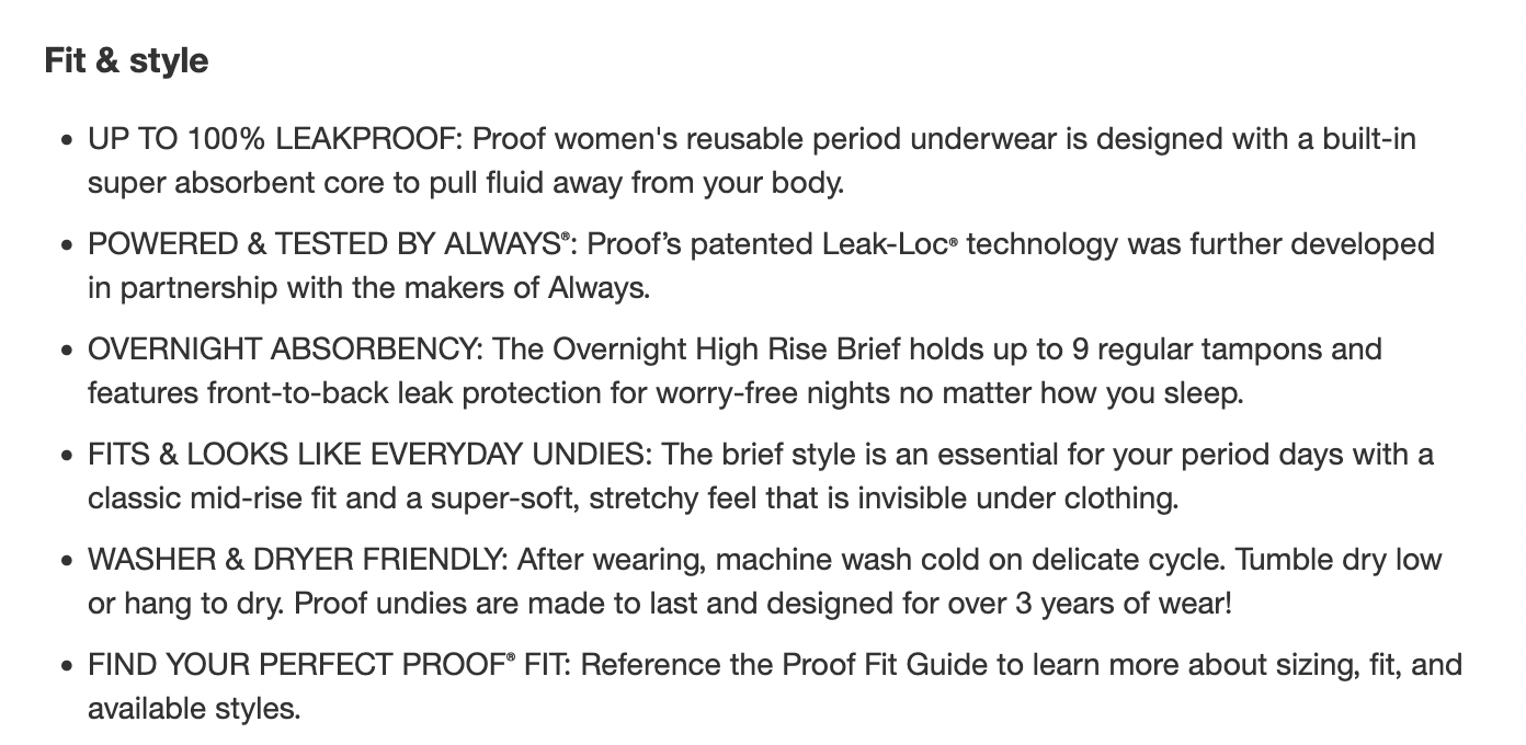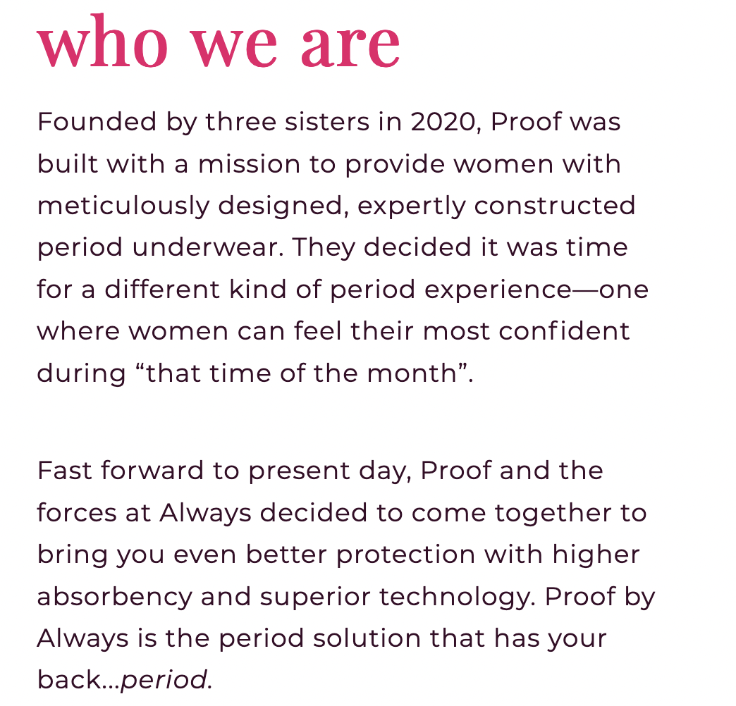 Lead copywriter before and during the Procter & Gamble acquisition of Proof period underwear
